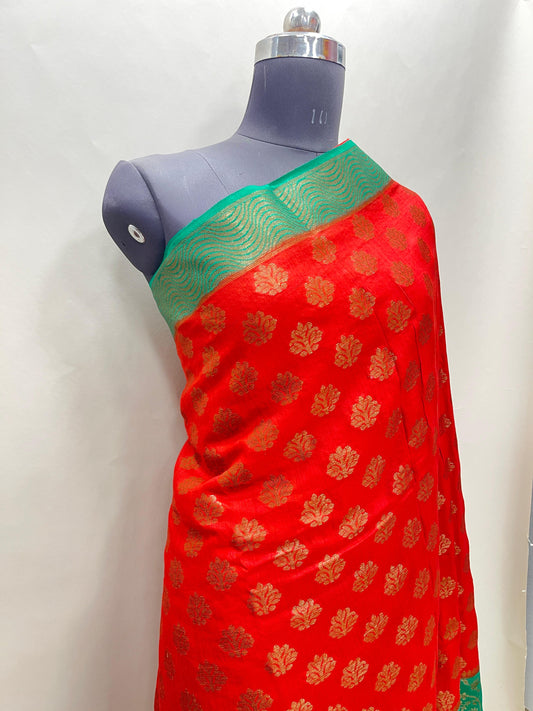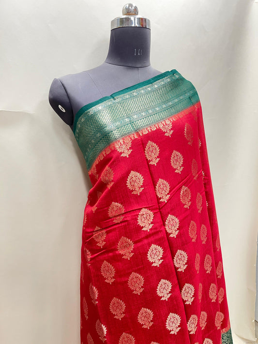 Faishana Pure Handloom Red Munga Silk Floral Gold Zari Booti with Contrast Green Floral Jaal Pallu Skirt Dual Shade Mina Zari Border with Green Blouse