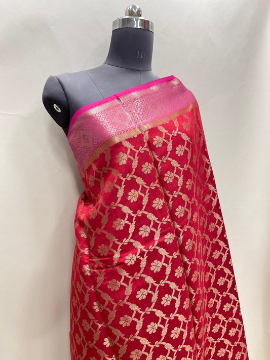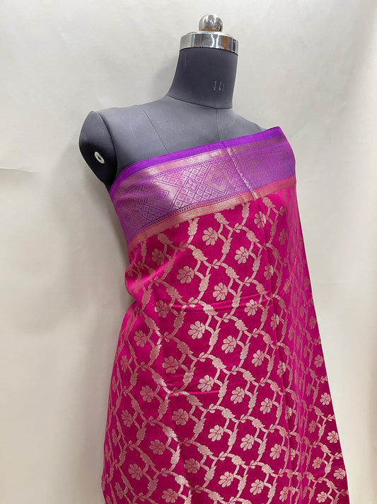 Faishana Pure Handloom Dark Pink Munga Silk Floral Gold Zari Jaal with Contrast Floral Jaal Skirt Dual Shade Zari Border with Magenta Blouse