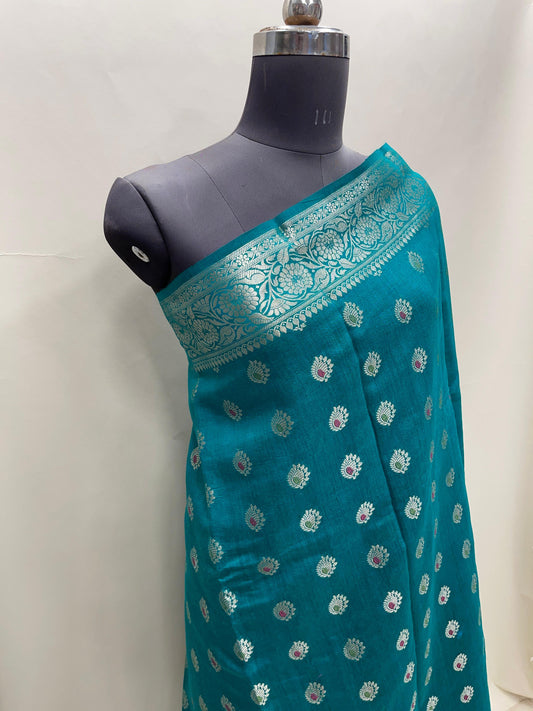 Faishana Pure Handloom Sea Green Munga Silk Floral Gold Mina Zari Booti with Banarasi Floral Jaal Pallu Zari Border with Sea Green Blouse