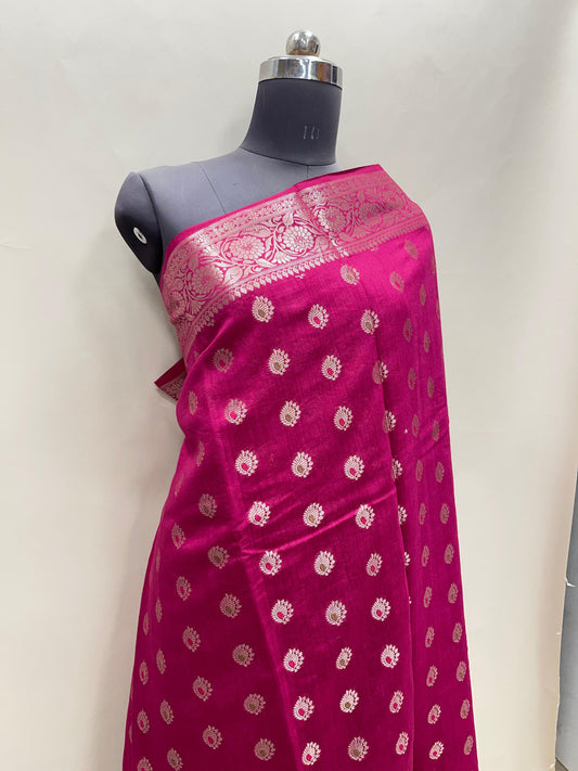 Faishana Pure Handloom Magenta Munga Silk Floral Gold Mina Zari Booti with Banarasi Floral Jaal Pallu Zari Border and Magenta Blouse
