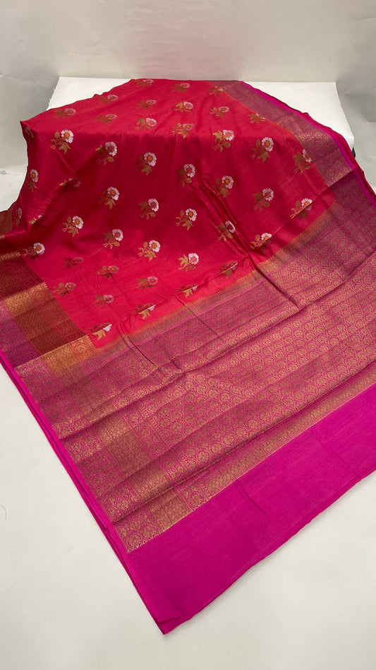 Faishana Pure Silk Handloom Red Muga Silk Zari Mina Floral Booti Contrast Magenta Anchal Copper Zari Border Banarasi Saree with Magenta Blouse