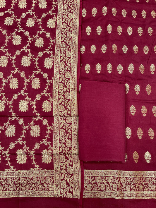 Puresilk Handloom Maroon Mulberry Silk Banarasi 3 pcs Suit Set RHN_MEL3