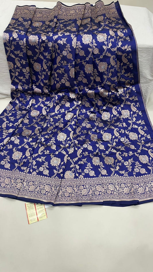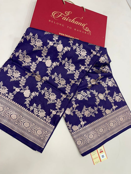 Faishana Pure Silk Handloom Uppada Navy Blue with Silver Zari Kadhwa Jaal Rich Pallu and Kadhwa Blouse Banarasi Saree