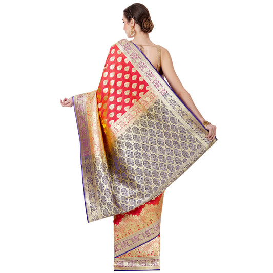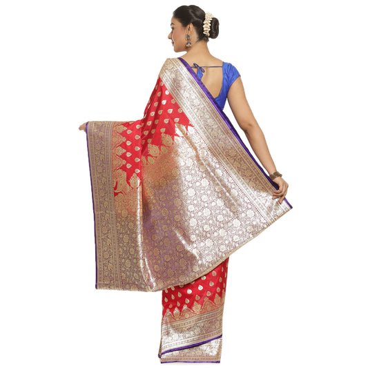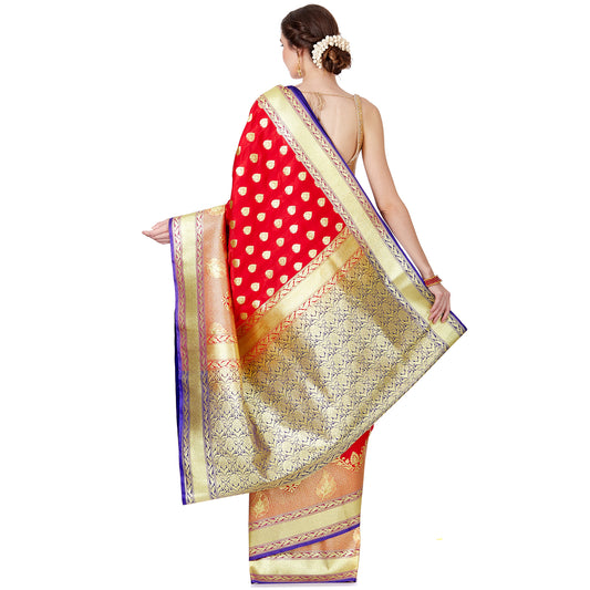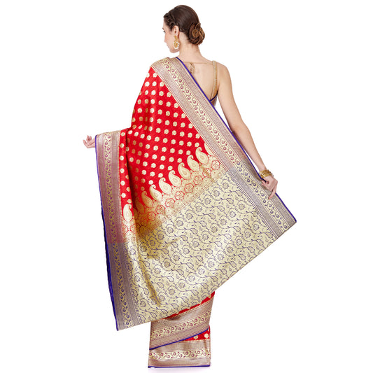 Faishana Presents Red Booti Mughal Motif Satin Silk Banarasi Saree Kadiyal Blue Borde