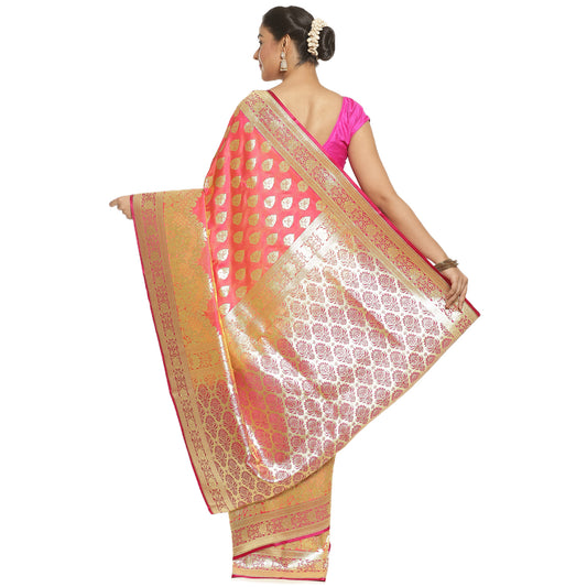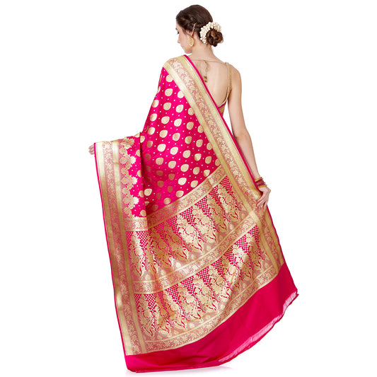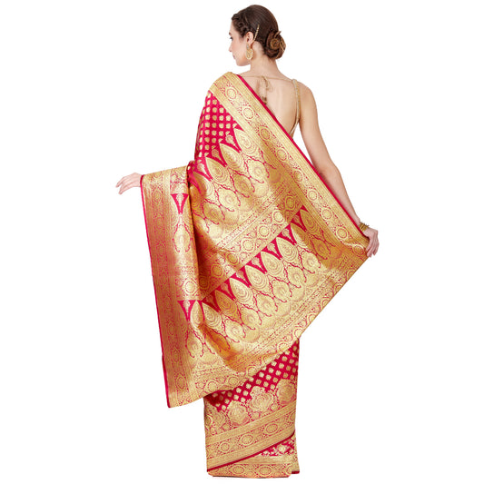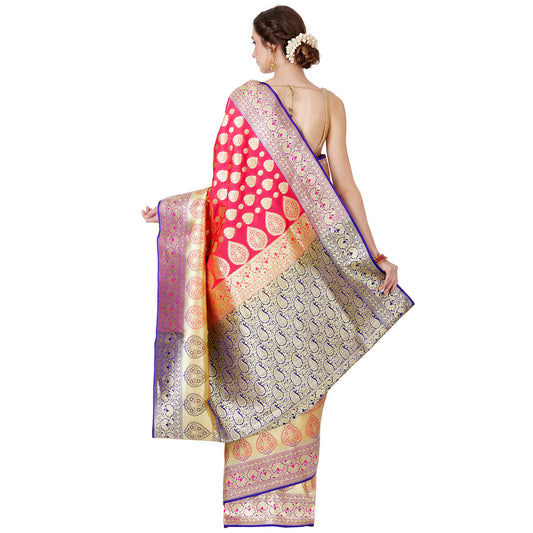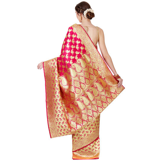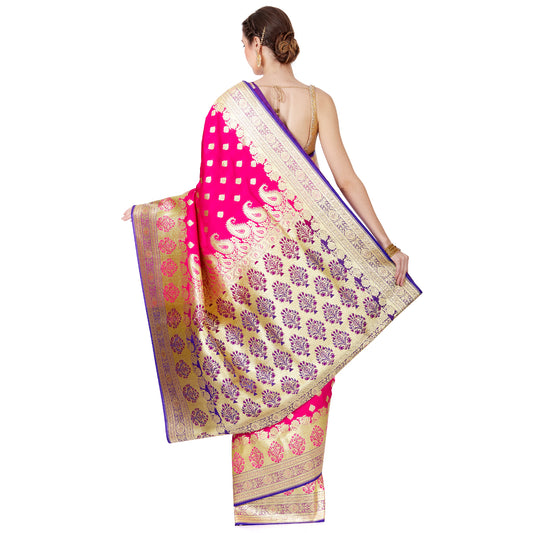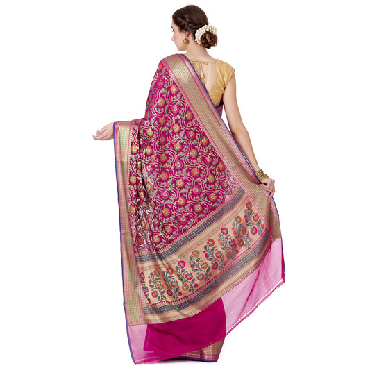 Faishana Presents Magenta Satin Silk Floral Minakari Zari Jaal Banarasi Saree with Paithani Pallu and Magenta Blouse Piece