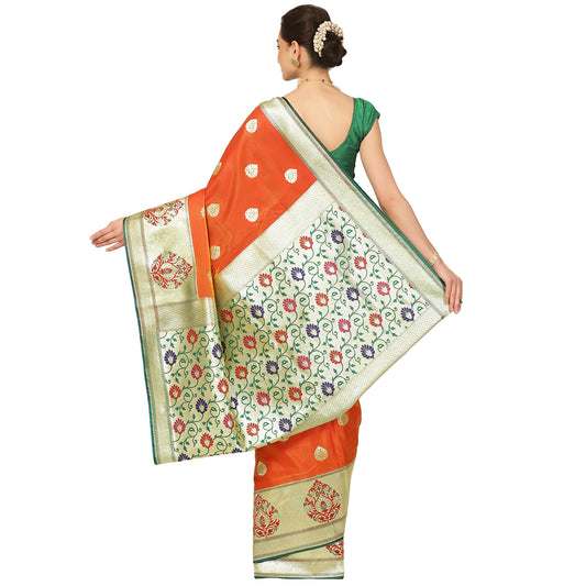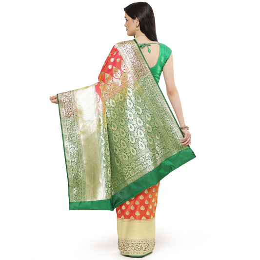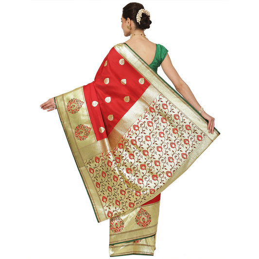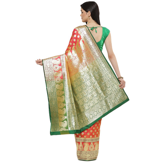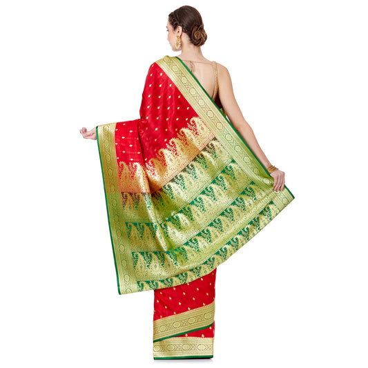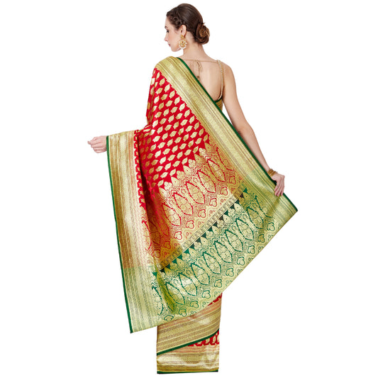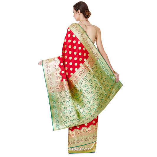 Faishana Presents Red Satin Silk Zari Booti Saree with Contrast Green Floral Jaal Pallu and Green Blouse Piece