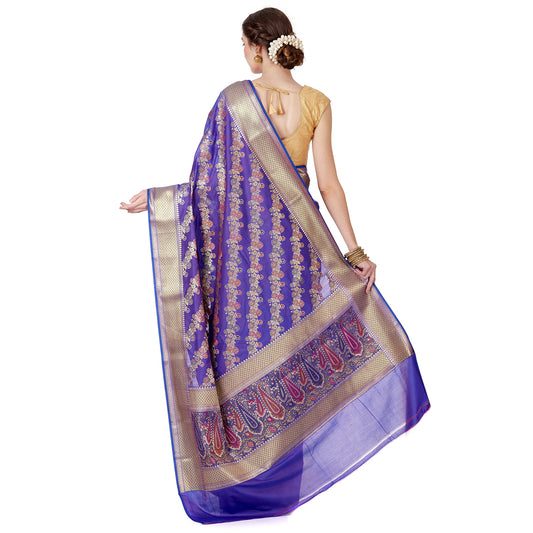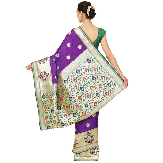 Faishana Presents Purple Satin Silk Floral Minakari Zari Stripe Saree with Paisley Minakari Pallu and Purple Blouse Piece