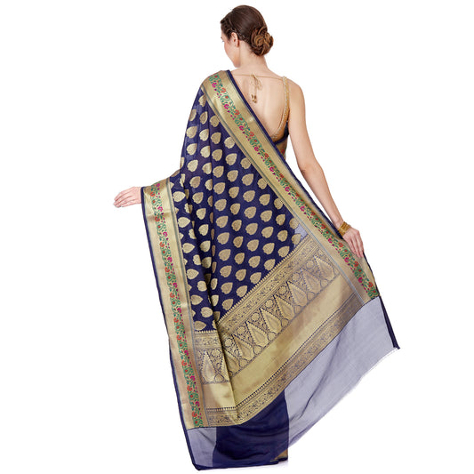 Faishana Presents Royal Blue Booti Paatli Half Half Mughal Motif Satin Silk Banarasi Saree With Skirt Borde
