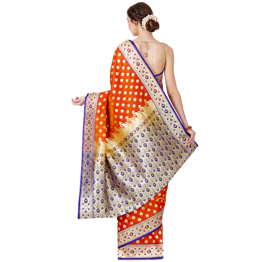 Faishana Presents Red Satin Silk Gold Zari Booti Skirt Floral Leaf Banarasi Saree with Contrast Blue Blouse Piece