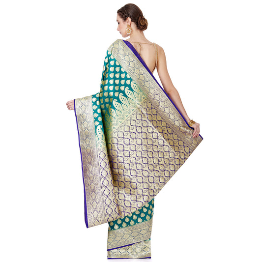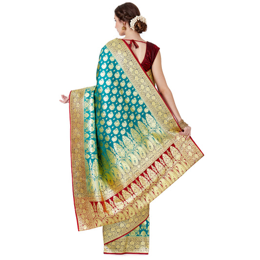 Faishana Presents Torquoise Blue Mughal Motif Satin Silk Banarasi Saree Skirt Kadiyal Blue Borde