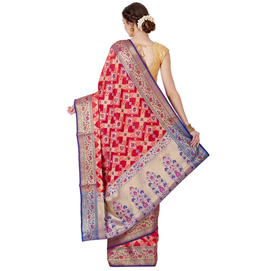 Faishana Presents Red Satin Silk Zig-Zag Zari Stripe Minakari Saree with Contrast Blue Paithani Pallu And Blue Blouse Piece