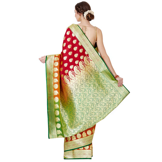 Faishana Presents Maroon Satin Silk Zari Booti Banarasi Saree with Contrast Green Paisley Pallu and Green Blouse Piece