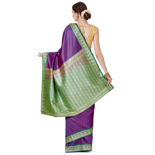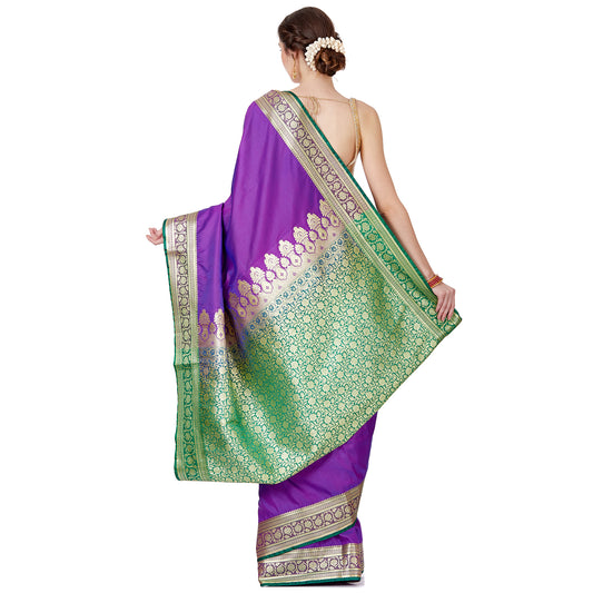 Faishana Presents Purple Plain Satin Silk Banarasi Saree with contrasting Green Floral Pallu and Green Blouse Piece
