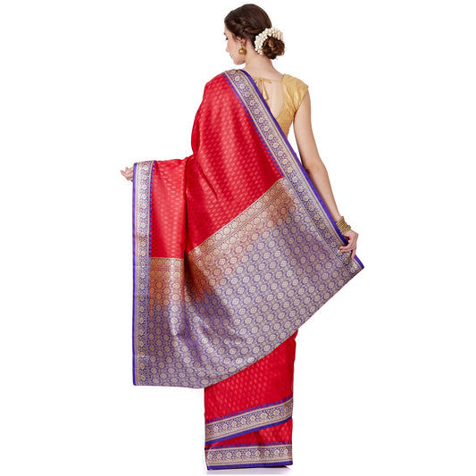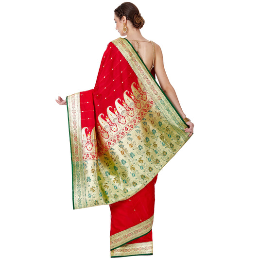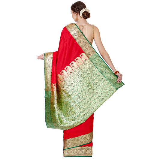 Faishana Presents Red Plain Satin Silk Banarasi Saree with contrasting Green Paisley Pallu and Green Blouse Piece
