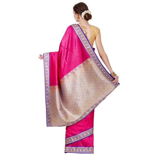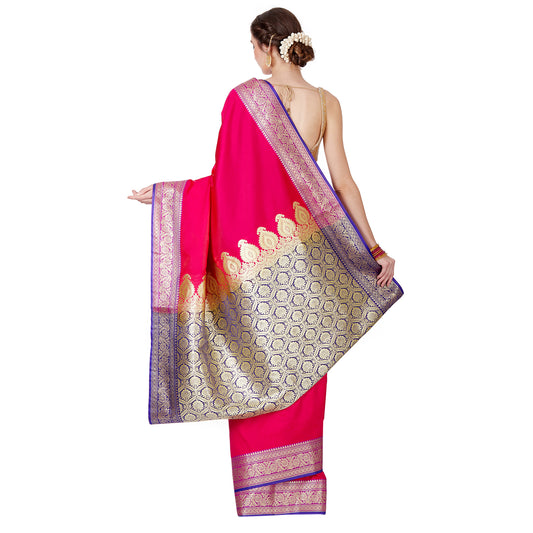 Faishana Presents Pink Plain Satin Silk Banarasi Saree with Contrasting Blue Pallu and Blue Blouse Piece