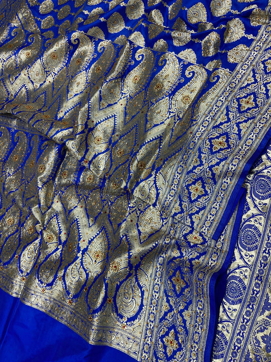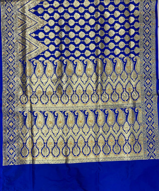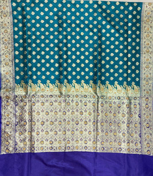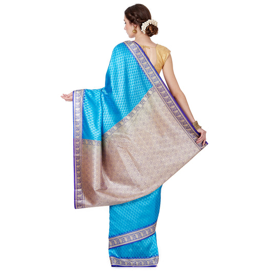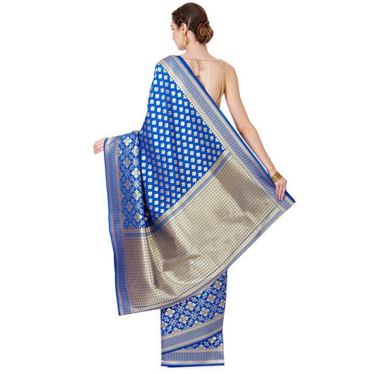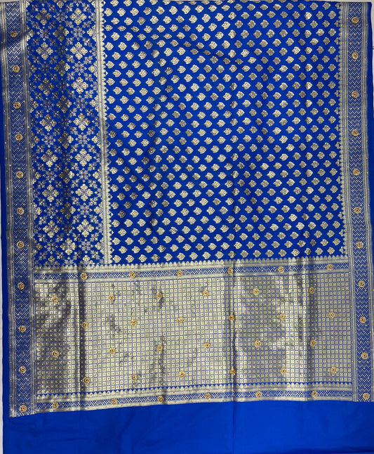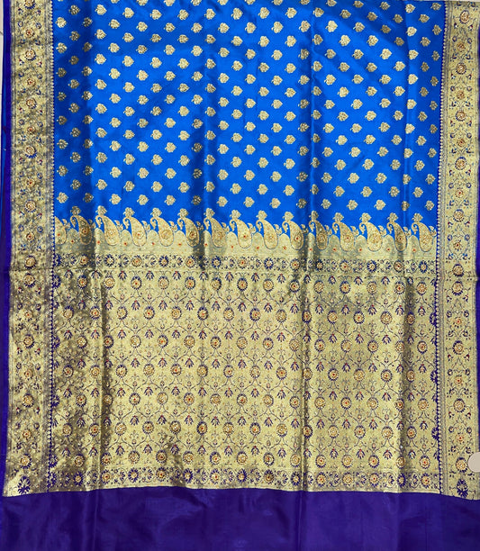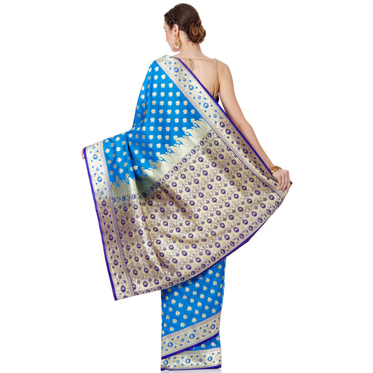 Faishana Presents Blue Satin Silk Zari Floral Booti Banarasi Saree with Blue Blouse Piece