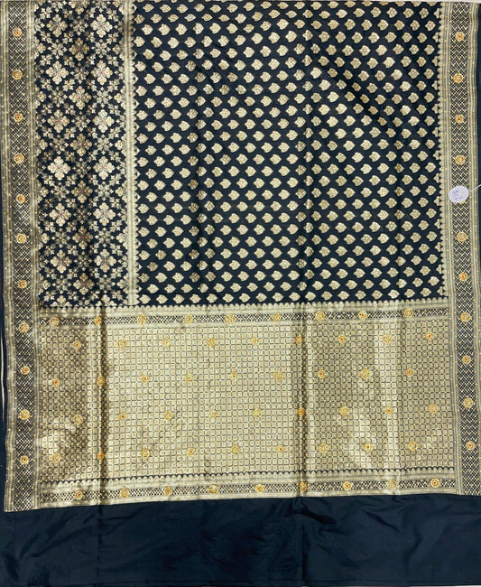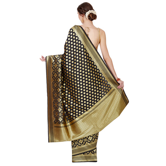 Faishana Presents Black Satin Silk Floral Zari Booti Banarasi Saree with Black Blouse Piece