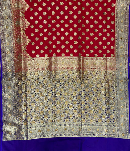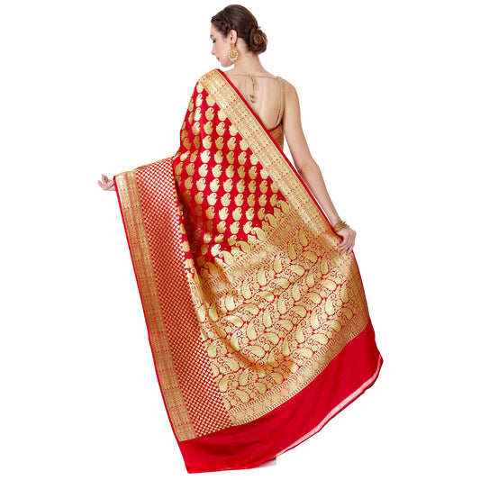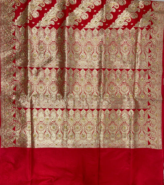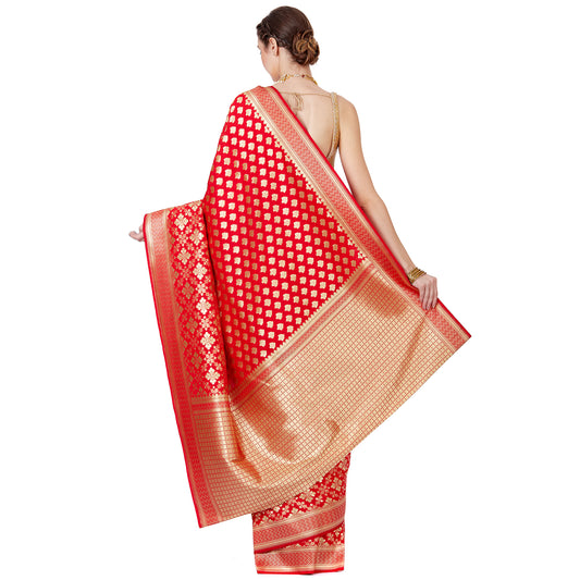 Faishana Presents Red Satin Silk Floral Zari Booti Banarasi Saree with Red Blouse Piece