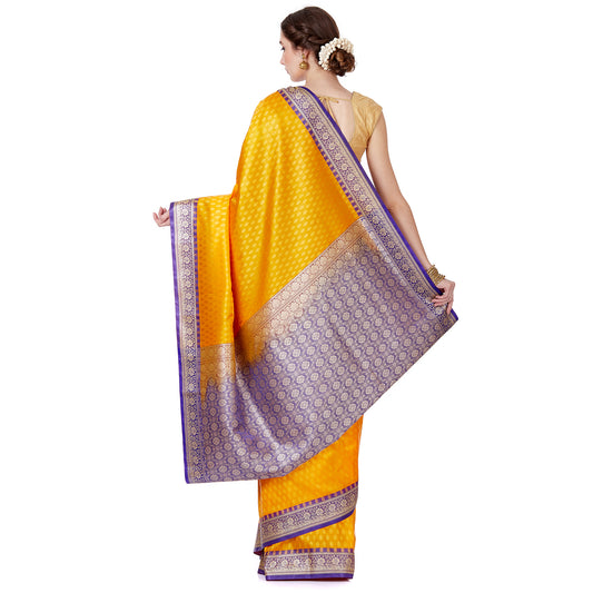 Faishana Presents Yellow Satin Silk Floral Booti Saree with Contrast Paisley Pallu and Violet Blouse Piece