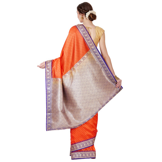 Faishana Presents Orange Satin Silk Floral Booti Saree with Contrast Paisley Pallu and Violet Blouse Piece