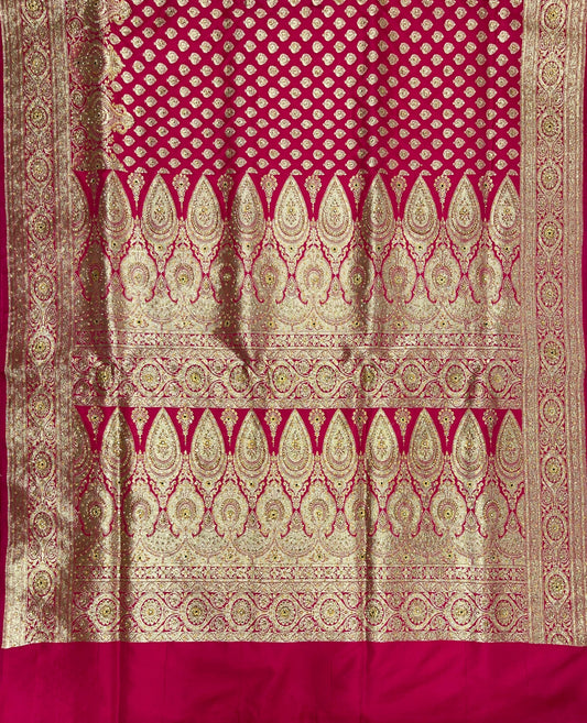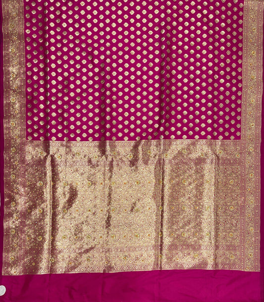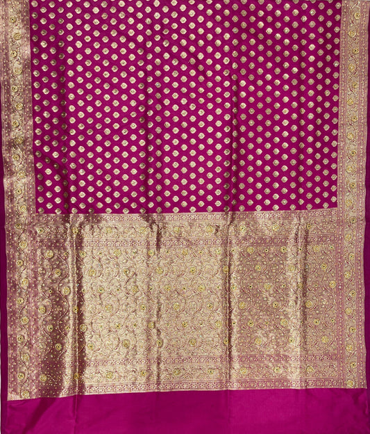 Faishana Presents Magenta Satin Silk Floral Zari Booti Heavy Stone Work Banarasi Saree with Lehariya Pallu and Magenta Blouse