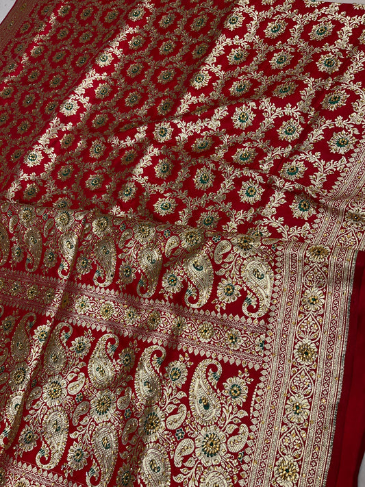 Faishana Presents Red Satin Silk Chunri Zari Booti Banarasi Saree with Contrast Green Floral Jaal and Green Blouse Piece