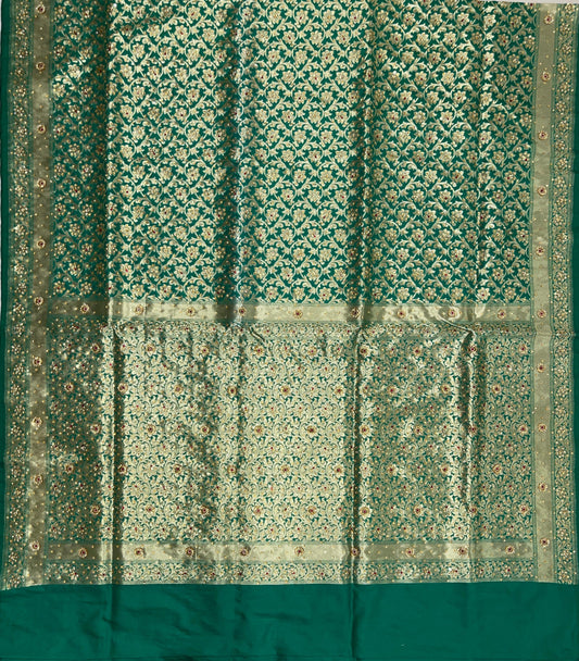 Faishana Presents Green Satin Silk Floral Zari Jaal Low Stone Work Banarasi Saree with Lehariya Pallu and Green Blouse