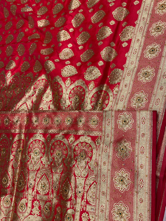 Faishana Presents Red Satin Silk Diagonal Zari Stripe Zari Jaal Heavy Stone Work Banarasi Saree with Red Pallu and Red Blouse