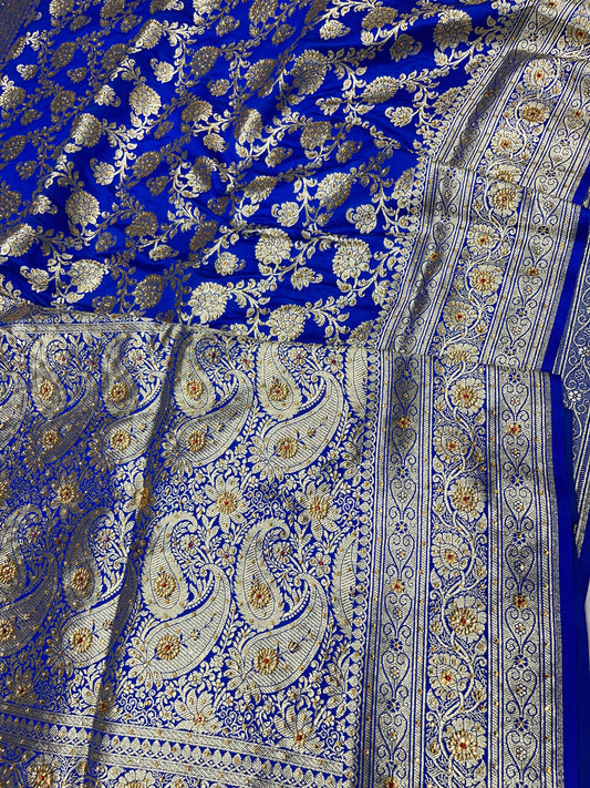 Faishana Presents Blue Satin Silk Floral Zari Jaal Low Stone Work Banarasi Saree with Paisley Zari Jaal Pallu and Blue Blouse
