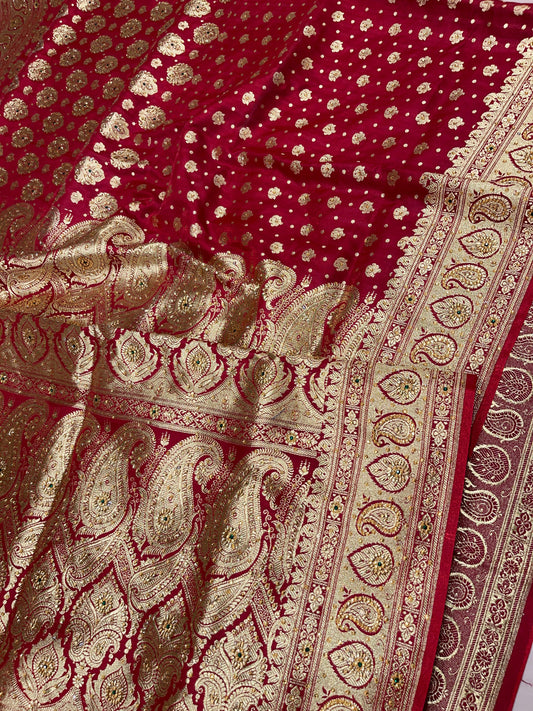 Faishana Presents Red Satin Silk Floral Mina Zari Jaal Low Stone Work Saree with Paisley Floral Pallu and Red Blouse