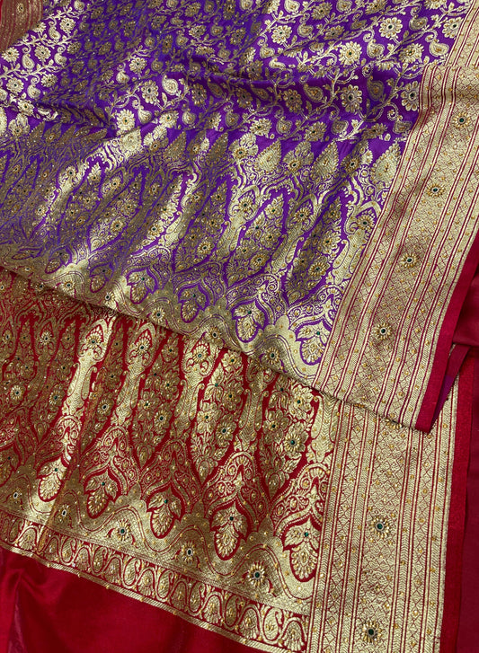 Faishana Presents Purple Satin Silk Floral Zari Tilfi Jaal Low Stone Work Saree with Contrast Maroon Banarasi Pallu and Maroon Blouse