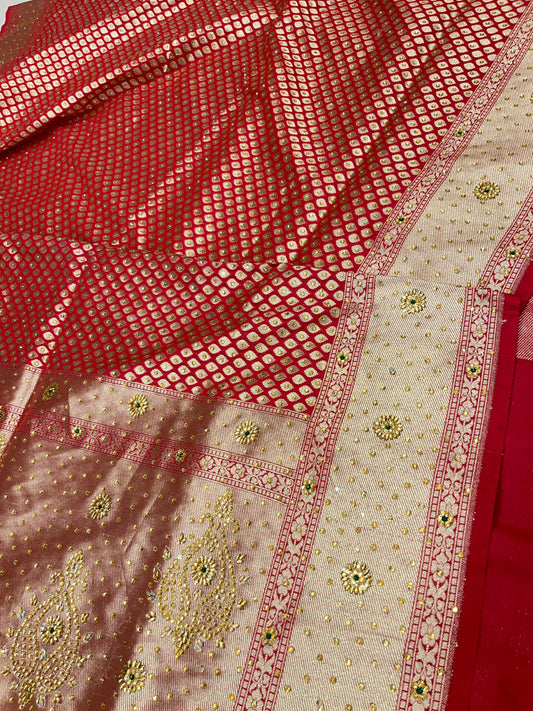 Faishana Presents Red Satin Silk Floral Booti Low Stone Work Saree with Banarasi Floral Pallu and Red Blouse