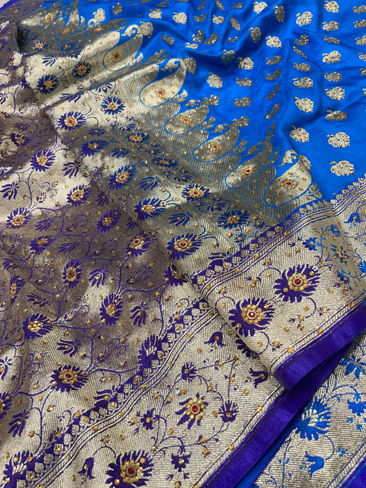 Faishana Presents Turqouise Blue Satin Silk Floral Zari Booti Heavy Stone Work Banarasi Saree with Contrast Blue Pallu and Blue Blouse