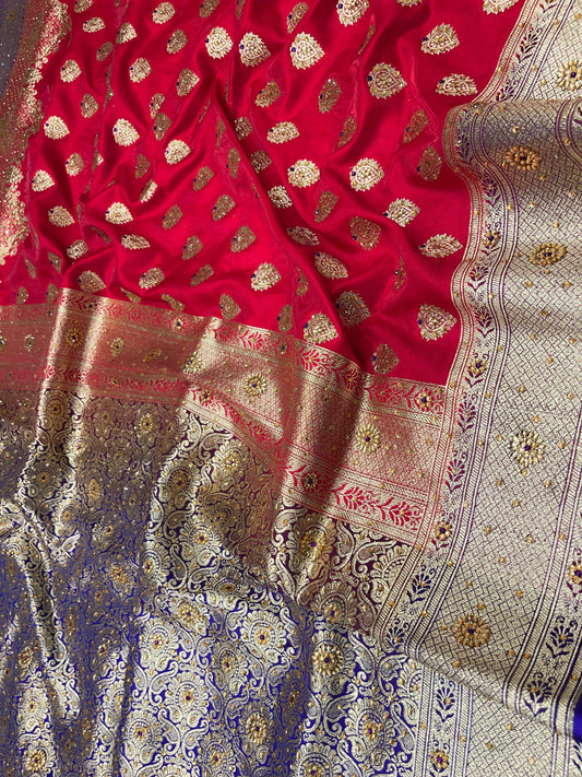 Faishana Presents Red Satin Silk Floral Zari Booti Heavy Stone Work Skirt Pan Boota Zari Border with Contrast Blue Pallu and Blue Blouse