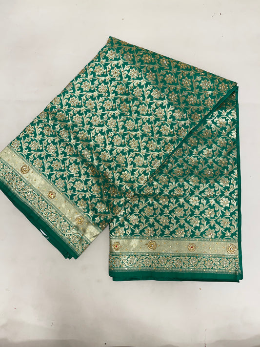 Faishana Presents a Green Satin Silk Stone Work Golden Zari Floral Jaal with Lehariya Jaal Pallu Zari Border Banarasi Saree and Green Blouse