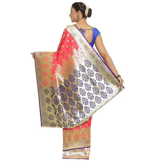 Faishana Presents Strawberry Satin Silk Mughal Motif Booti With Skirt Kadiyal Paithani Blue Pallu & Border and Blue Blouse Banarasi Saree