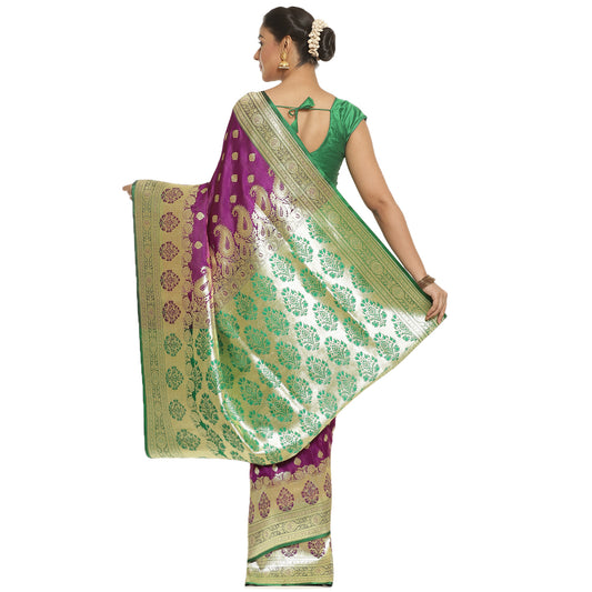Faishana Presents Dark Purple Satin Silk Mughal Motif Booti With Skirt Kadiyal Paithani Green Pallu & Border and Green Blouse Banarasi Saree