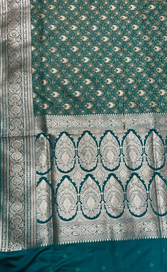 Faishana Presents Sea Green Tanchoi Satin Silk Alfi Mina Zari Booti with Silver Zari Big Boota Pallu and Silver Zari Border Banarasi saree with Sea Green Blouse