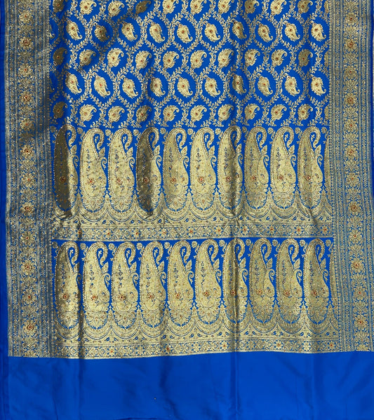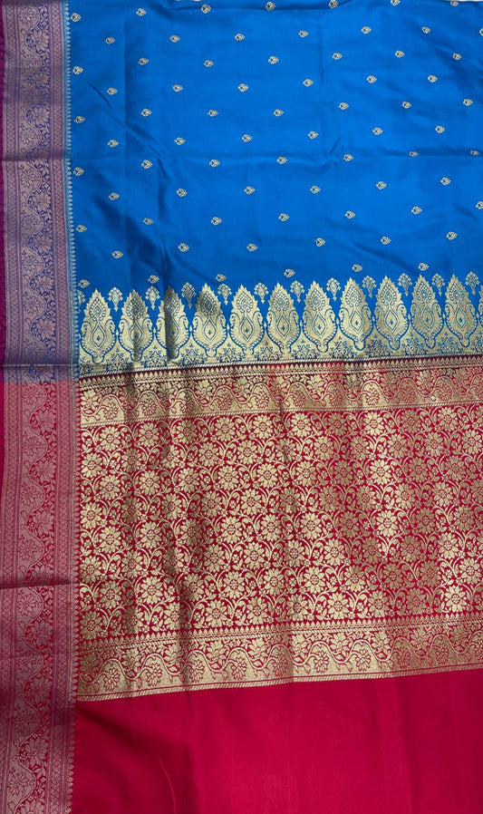 Faishana Presents Royal Blue Satin Silk Gold Zari Lachha Booti and Contrast Red Floral Zari Border and Heavy Gold Zari Jaal Pallu Banarasi saree with Red Blouse