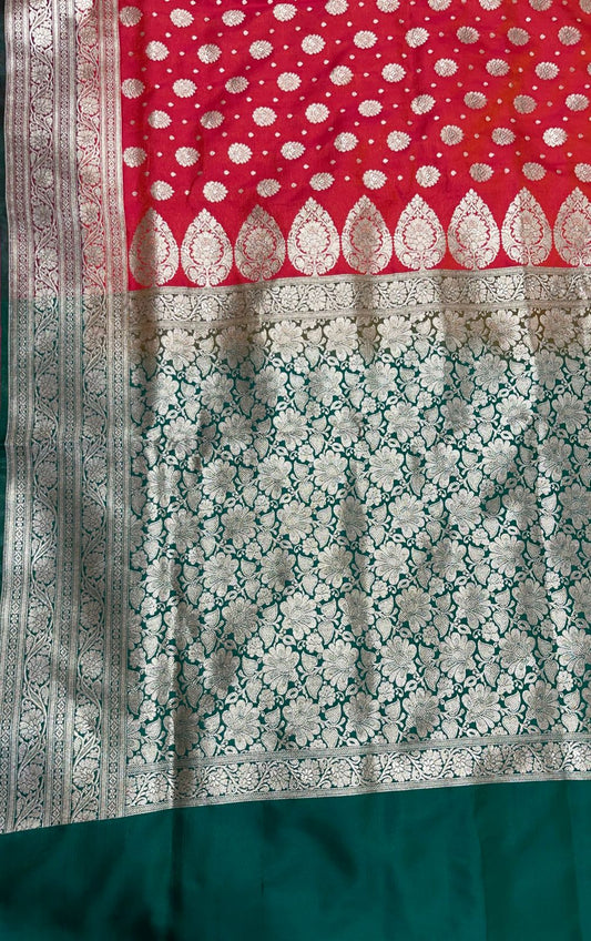 Faishana Presents Red Satin Silk Floral Leaf Zari Booti Low Stone Work Banarasi Saree with Contrast Green Pallu and Green Blouse