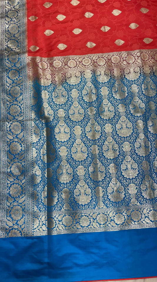 Faishana Presents Red Satin Silk Silver Zari Booti Mina Jaal Banarasi saree and Contrast Blue Silver Zari Boota Pallu with Blue Blouse