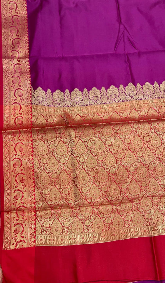 Faishana Presents Magenta Plain Satin Silk with Contrast Red Zari Border and Red Blouse Banarasi saree