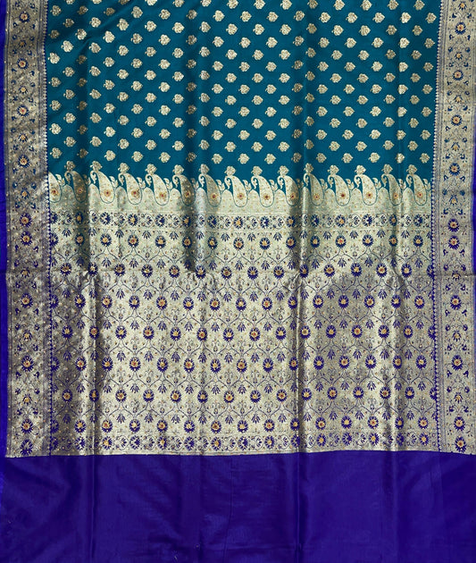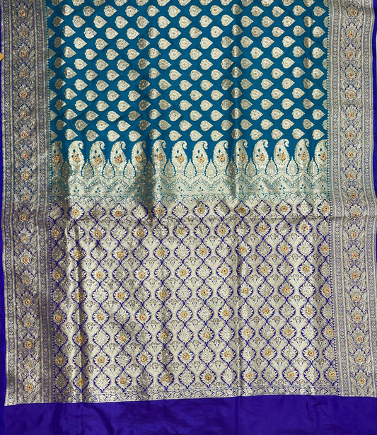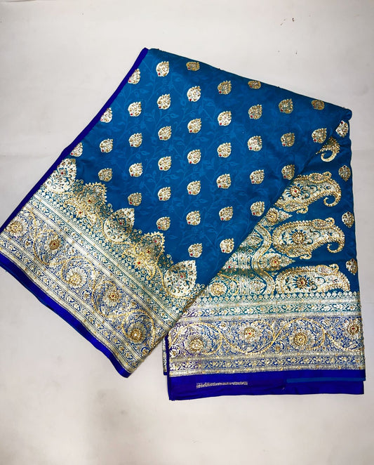 Faishana Presents Turqouise Blue Stone Work Golden Zari Booti Jaal with Paisely Boota Pallu Zari Border Banarasi Saree