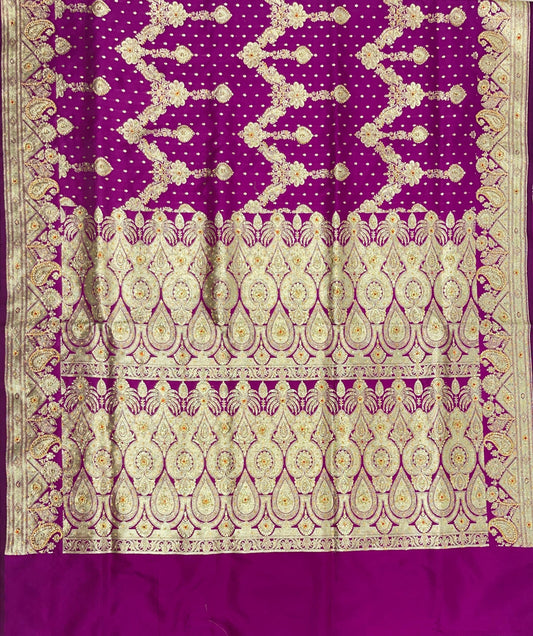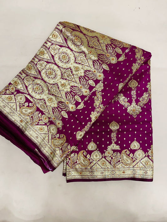 Faishana Presents Purple Stone Work Golden Zari Zig-Zag Stripe Booti Jaal with Floral Heavy Pallu Zari Border with Purple Blouse Banarasi Saree