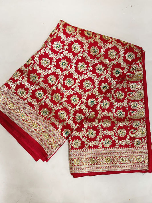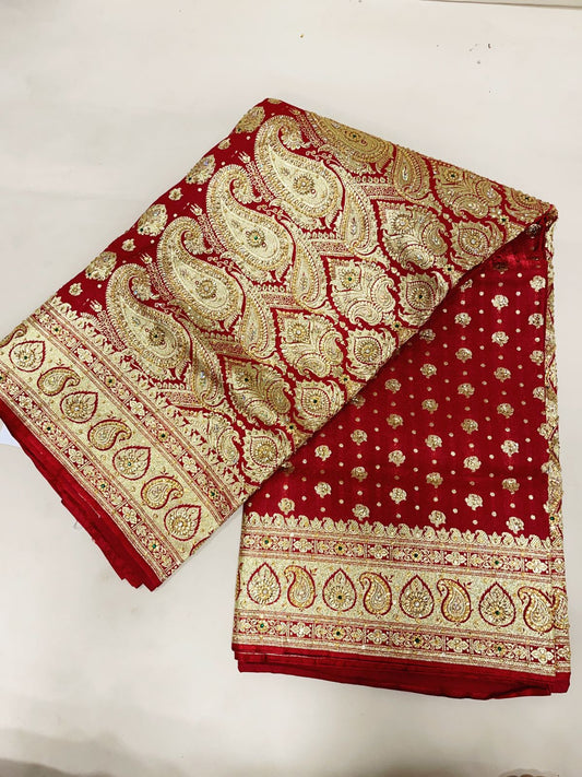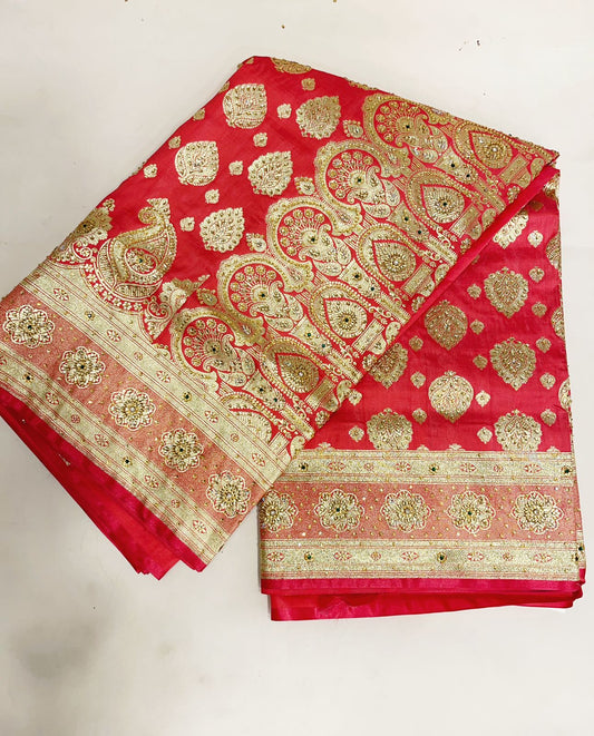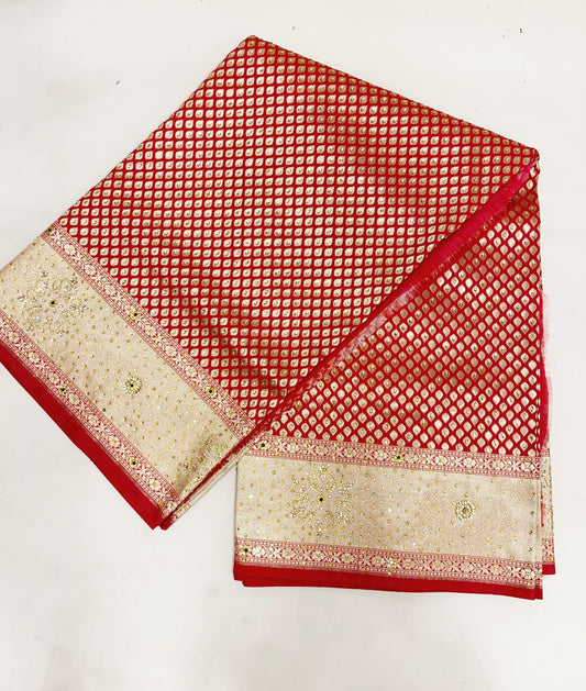 Faishana Presents Red Satin Silk Stone Work Golden Zari Chunri Booti with Banarasi Zari Border and Red Blouse
