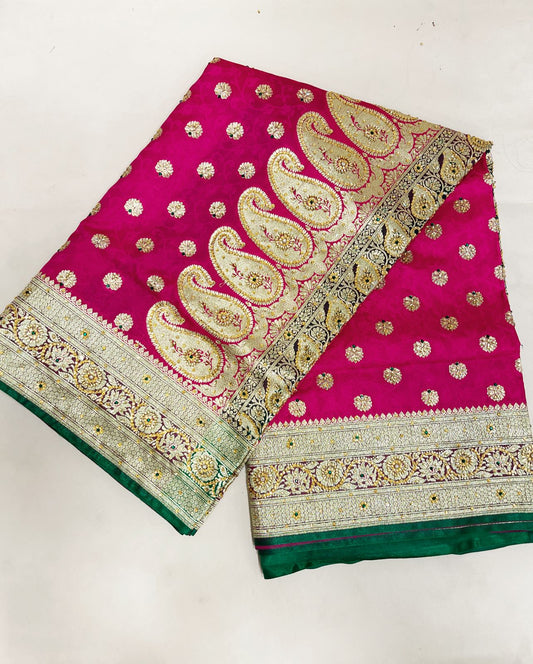 Faishana Presents Pink Stone Work Golden Zari Floral Booti with Contrast Green Paisley Pallu Zari Border and Green Blouse Banarasi Saree