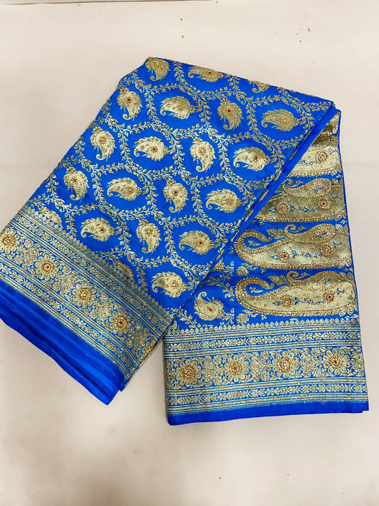 Faishana Presents Blue Satin Silk Floral Zari Booti Low Stone Work Skirt Zari Border with Banarasi Pallu and Blue Blouse