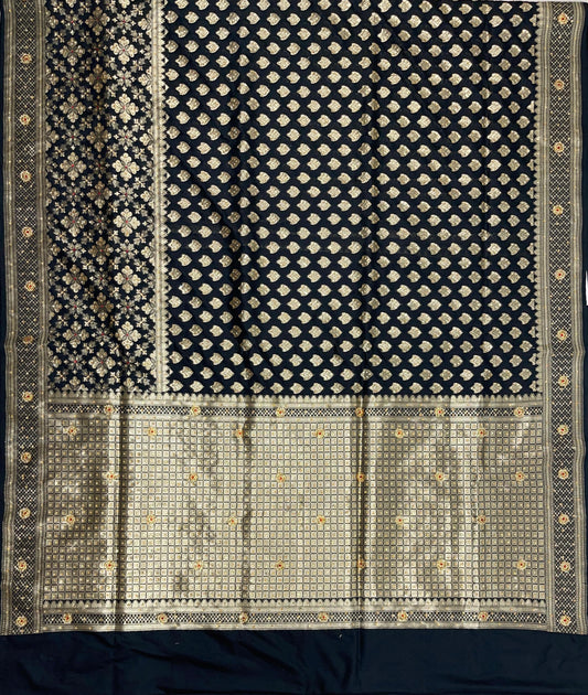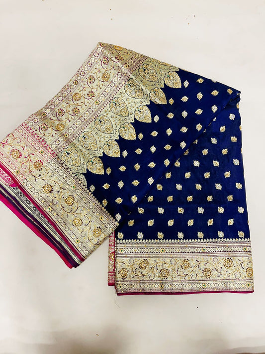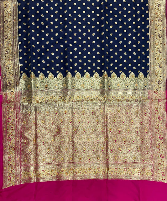 Faishana Presents Navy Blue Stone Work Golden Zari Chunri Booti with Contrast Magenta Alfi Boota Pallu Zari Border With Magenta Blouse Banarasi Saree