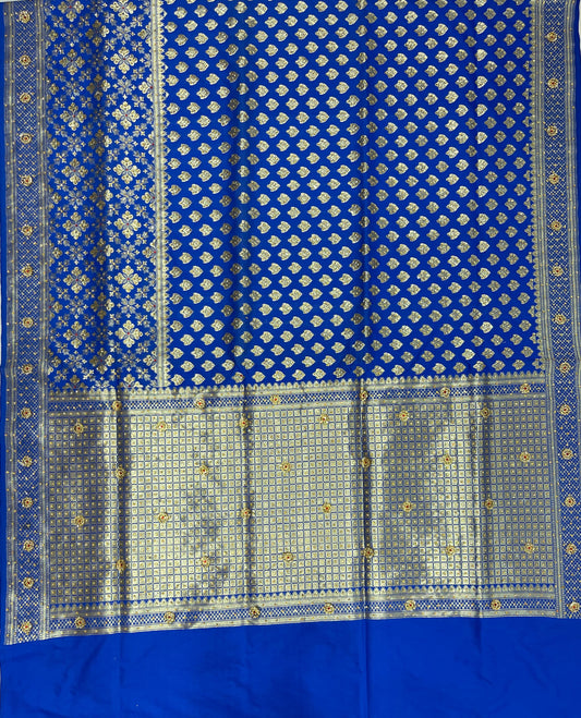 Faishana Presents Blue Satin Silk Floral Zari Booti Low Stone Work Banarasi Saree with Checkered Pallu Skirt Zari Border and Blue Blouse