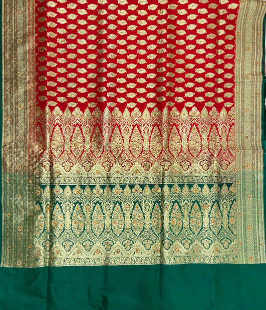 Faishana Presents Red Stone Work Golden Zari Floral Booti with Contrast Green Boota Pallu Zari Border with Green Blouse Banarasi Saree